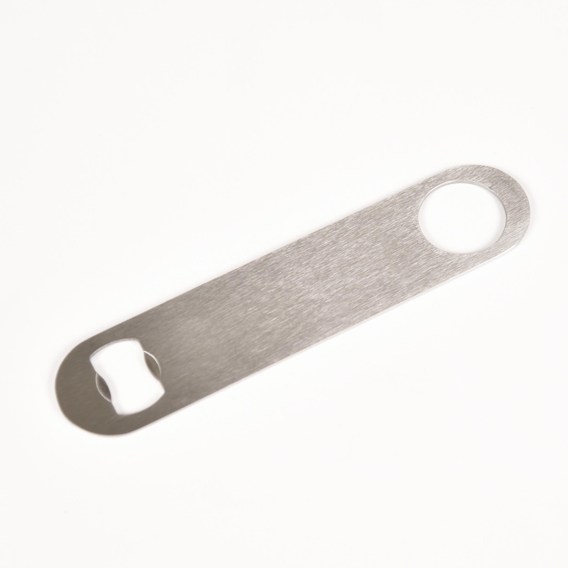 • Abridor de garrafas metálico prateado com furo circular numa extremidade