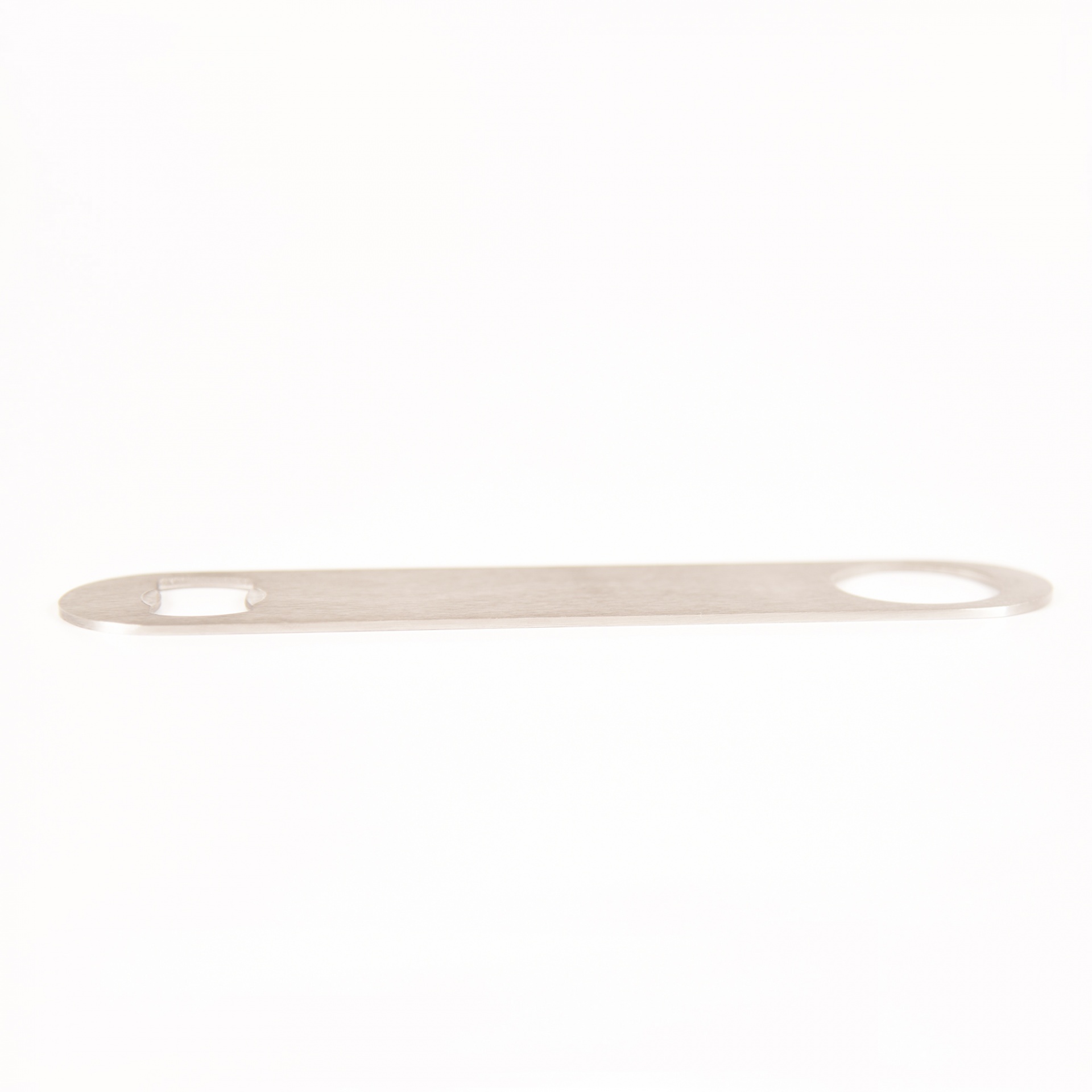 • Ferramenta metálica longa com orifícios ovais em cada ponta sobre fundo branco