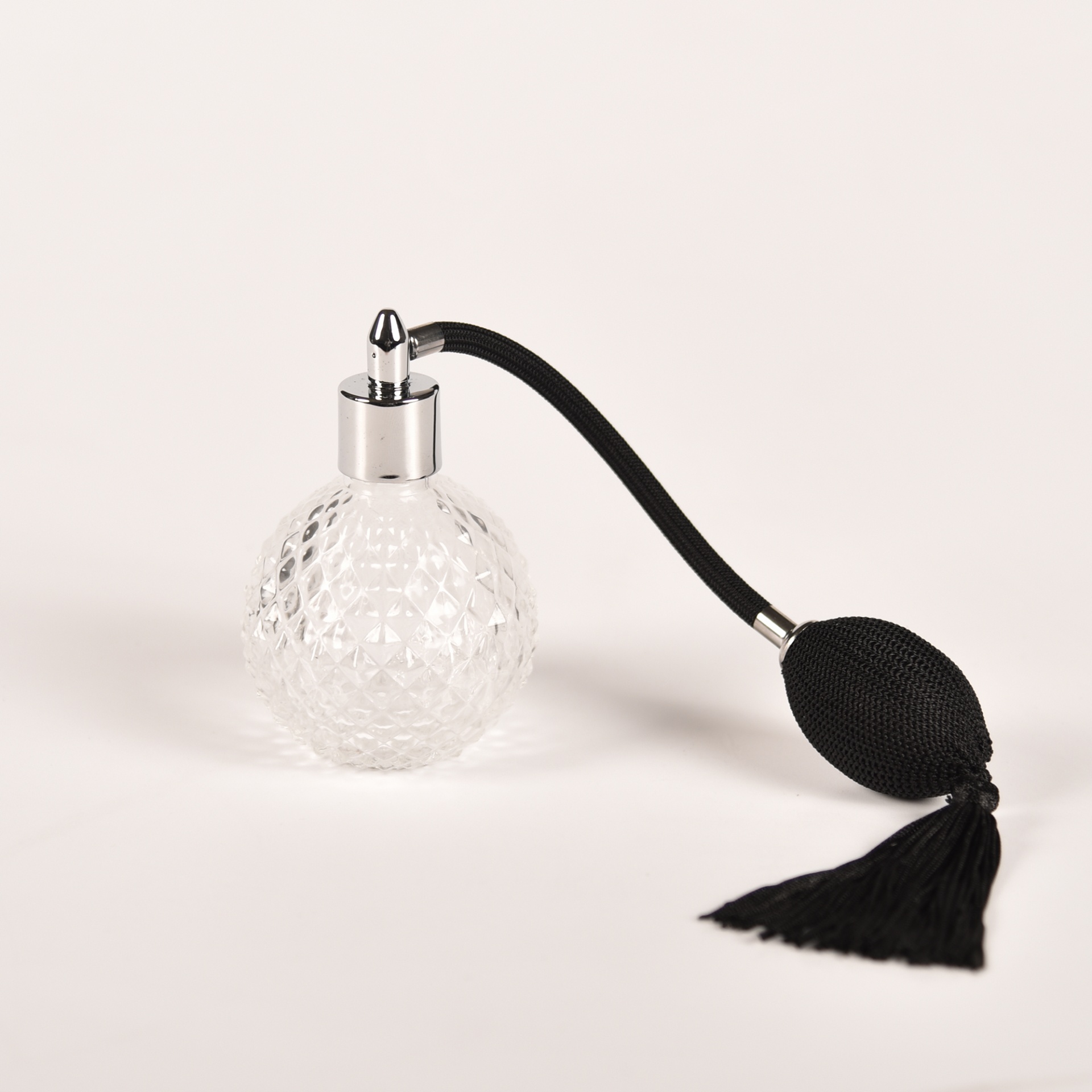 • Frasco de perfume vintage em vidro transparente com pulverizador manual preto