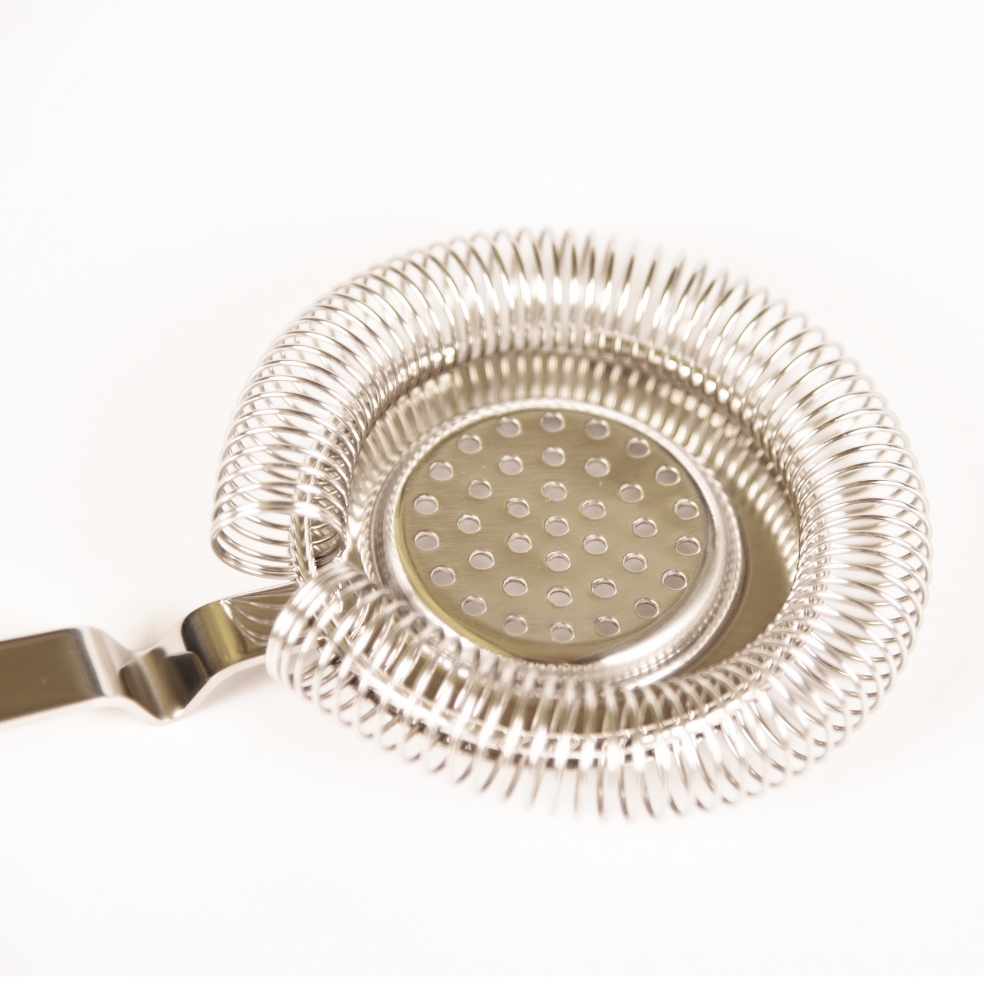 • Coador de coquetel metálico prateado com mola circular e furos no centro